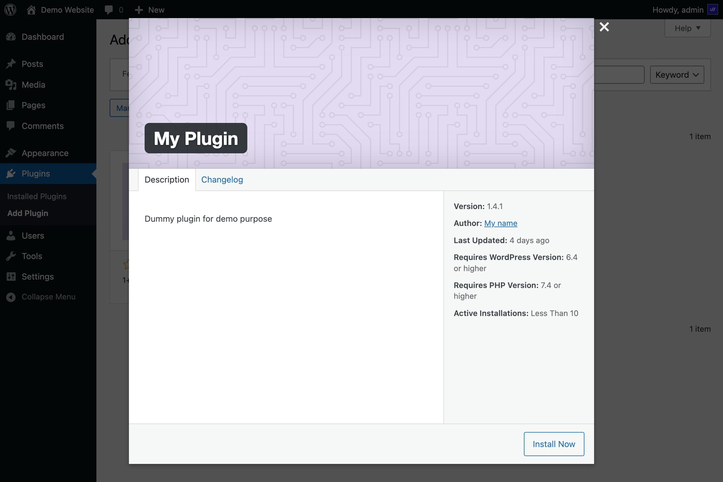 In WordPress, when you click “See details” link on a plugin card, a preview is shown with some tabs :